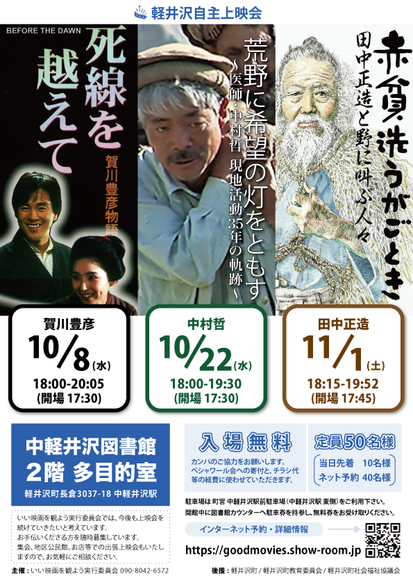 10月・11月は、賀川豊彦さん、中村哲さん、田中正造さんの映画を上映します!