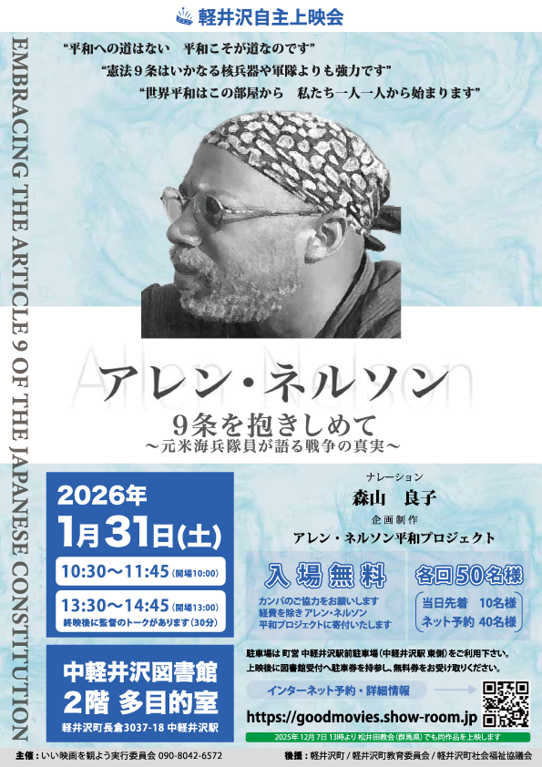UPDATE! 2026年1月 上映会のお知らせ 「アレン・ネルソン 9条を抱きしめて 〜元米海兵隊員が語る戦争の真実〜」 中軽井沢図書館 2階 多目的室 入場無料 定員50名様 13:30〜の回は、終映後に監督のトークを予定しています。 予約入場について 先着50名様のうち40名様までの予約を受付ています。 10名様は当日お並びいただくお客様にとってあります。 予約の方は上映時間の5分前までに、ご来場をお願いします。 上映時間の5分前までにご来場いただけない場合は予約を取り消し、お並びのお客様にお入りいただきます。 ご理解とご協力お願い申し上げます。 1/31 10:30 上映会 予約サイトへ 1/31 13:30 上映会 予約サイトへ